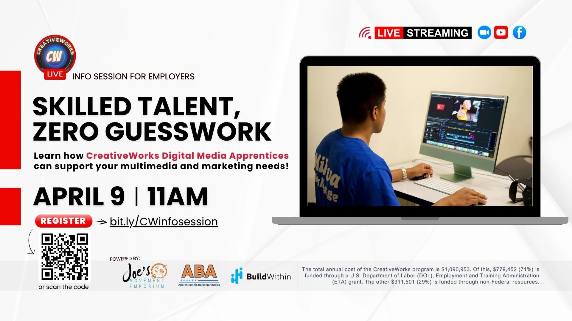 The CreativeWorks Registered Apprenticeship Program connects employers across all industries with trained apprentices who bring real-world skills in social media management, video production, graphic design, content creation, and more.
